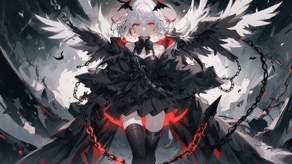masterpiece,best quality,illustration,extremely detailed CG unity 8k,cowboy shot,contour deepening beautiful detailed glow,(black theme:1.3),portrait,(1 girl:1.4),angel,(((black)) angel wings),full body,floating in sky, (white hair:1.2),blackstreaked hair,Beautiful and detailed black, (((black)) Wings:1.3),(beautiful detailed red eyes), black expressionless, beautiful detailed white gloves, (crow), bat,long disheveled hair, long bangs, hairs between eyes, black knee-highs, black ribbon, white bowties,((Black fog)), Red eyes, (black smoke), ((Black feathers floating in the air)),(((chains))),(anklet),(lock),(leg lock),cross-laced footwear,(backlighting),((glowing eyes))dark sky,Floating black ashes, ((The black clouds)),a black cloudy sky,(red moon:1.3)<lora:Ask_v2:0.2> <lora:米山舞_v2:0.2> <lora:lightAndShadow_v10:0.2> ,<lora:BondageOutfitV1 (1):0.4>BONDAGE_OUTFITDOMINATRIX