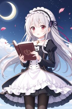 1girl, book, solo, pantyhose, flower, dress, petals, long hair, cross, red eyes, black pantyhose, lolita fashion, crescent moon, open book, sky, blush, holding, jewelry, hairband, looking at viewer, ribbon, necklace, moon, cloud, grey hair, long sleeves, lolita hairband, holding book, frills, outdoors