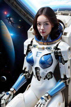 masterpiece, best quality, 1girl, translucent skin,  Blue and White bodysuit, mechanical, cowboy shot, space, sitting, from above, large breasts, bone, (Spacesuit:1.0),(Mecha:1.0) ,machinery,, Mecha,