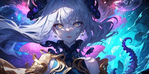 best quality,Amazing,Beautiful golden eyes,finely detail,Depth of field,extremely detailed CG unity 8k wallpaper,(1 girl :1.5),Deep sea background,jellyfish,masterpiece,fluttered detailed splashs, beautiful detailed water,cosmic eyes,Shock sensation,(realistic :0.5),octopus,original<lora:beautifulDetailedEyes_v10:0.5>, <lora:lightAndShadow_v10:0.5> <lora:fashionGirl_v45:0.4> <lora:epiNoiseoffset_v2:0.4>