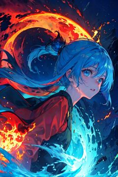 masterpiece, best quality,extremely detailed CG unity 8k wallpaper, best quality, extremely detailed, detailed, art of light novel cover,highres,(anime screencap),((Beautiful and detailed explosion)),((outdoors, nature,flame_sea,blue fire,dark sky with dark clouds:1.25)),(1girl:1.5) ,(night),stars,moon light,explosion,Burn oneself in flames,Good looking flame,(aurora:0.5)((world of flames,Red Moon)),<lora:beautifulDetailedEyes_v10:0.5>, <lora:lightAndShadow_v10:0.5> <lora:fashionGirl_v45:0.4> <lora:epiNoiseoffset_v2:0.4> <lora:LoraAtdanStyleFor_loraV10:0.3> <lora:yoneyamaMaiStyle_yoneyamaMaiV2Locon:0.3>