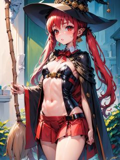 (masterpiece), (best quality),make up, blush, earring, <lora:geniewiz:0.9>, witch hat, red hair, broom, small breasts, loli,