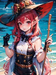 (masterpiece), (best quality),make up, blush, earring, <lora:geniewiz:0.9>, witch hat, red hair, broom, small breasts, loli,