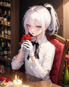 candle, gloves, flower, solo, white hair, white gloves, male focus, looking at viewer, shirt, 1boy, food, bottle, wine bottle, wine glass, drinking glass, candlestand, black ribbon, ribbon, blue eyes, cup, own hands together, white flower, rose, hair between eyes, white shirt, grapes, wine, alcohol, fruit, bangs, long sleeves, red flower, table, bow, upper body, black bow, sitting, collared shirt, neck ribbon, low ponytail, hair ribbon, chair, androgynous, bouquet, ponytail, fire, red rose,