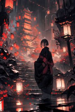 (masterpiece:1.2), best quality,realistic,Tyndall effect,night, lantern, tree, scenery, outdoors, 1boy, solo, black hair, japanese clothes, from behind, male focus, standing, east asian architecture, architecture, sky, night sky, stairs, facing away,Red lycoris, <lora:ghostdom_20230621222536-000019:1>