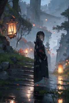 (masterpiece:1.2), best quality,realistic,Tyndall effect,lantern, 1girl, outdoors, scenery, bird, night, grass, solo, black hair, artist name, sky, standing, water, tree, rock, building, paper lantern, night sky <lora:ghostdom_20230621222536-000016:1>