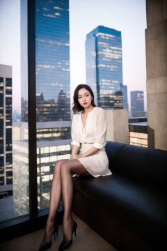 (nikon RAW photo, 8k), (photorealistic:1.3),1girl, full body, solo, fashion portrait, fashionable outfit, stuning dress, pleated skirt, (black pantyhose), rooftop garden, roofbar, couch, fancy restaurant, table, city background, highrises, skyscraper,cinematic lighting, night view, ((light particles)), realistic, morning sun, dynamic, fresh,best quality, exquisite details, high-resolution, 85mm film, timeless elegance. portrait photography, 85mm film, natural blurry <lora:h2iai_fullshot_v0.1:0.75> <lora:perfectpantyhose:0.6>