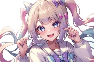 Needy Girl Overdose,OMGkawaii Angel,1girl,solo,blue eyes,bow,pink hair,hair bow,blue hair,multicolored hair,school uniform,v,smile,quad tails,open mouth,multicolored nails,looking at viewer,bangs,simple background,upper body,sailor collar,white background,long sleeves,serafuku,blonde hair,long hair,shirt,purple bow,makeup,nail polish,<lora:Wss-000008:0.8>,