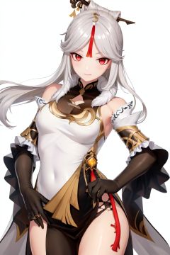 (8k, best quality, masterpiece), ultra-detailed, (high detailed skin), <lora:(v2)nguang-000004:1>, nguang, bangs, bare_shoulders, black_gloves, china_dress, claw_ring, detached_sleeves, elbow_gloves, frilled_sleeves, frills, hair_ornament, hairpin, long_hair, ningguang_\(genshin_impact\), parted_bangs, red_eyes, silver_hair, tassel, (white background, simple background:1.4), (black outline:1.2),