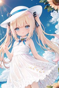 masterpiece, ((best quality)), (ultra-detailed), (illustration), an extremely delicate and beautiful girl, dynamic angle, chromatic aberration, ((colorful)),movie,1girls,loli,little girl,petite child,//,lens flare,dramatic, coastal,pale-blonde hair, blue eyes,very long twintails,white hat,blue sky,laugh,double tooth,fang,floatingflying petal, flowery field, sky, sun,field, sunflower , //, (strong rim light:1.2), god light, Tyndall effect, bloom, glowing,(lens flare,ray tracing:1.2),depth of field, blurry foreground,