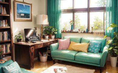 living room,couch,window,curtains,dappled sunlight,potted plant,table,cabinet,bookshelf,paper,desk lamp,typewriter,