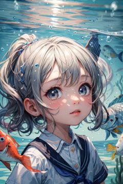 loli,(child),(toddler),(petite),(cute face),abstract background,(illustration:1.0), masterpiece, best quality, detailed face and eyes,1 girl, school uniform, underwater hair physics, air bubbles, light coming through water, reflections , laying in water, split layers of water, school of fish,.