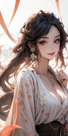, masterpiece, best quality,1girl, jewelry, solo, earrings, necklace, smile, black hair, breasts, cleavage, looking at viewer, white background, upper body, long hair, simple background, closed mouth, black eyes, medium breasts, chinese clothes, lips