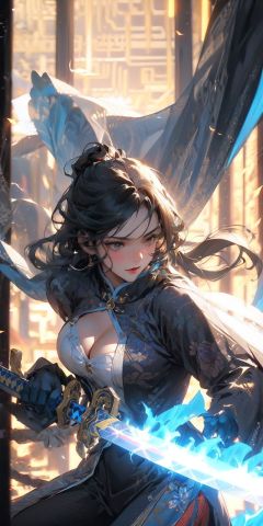 , masterpiece, best quality,swordman,holding a sword(trees:0.5),(eagle:0.5), (bamboo:0.2) fighting stance, Hangzhou, glowing,solo, weapon, sword, tree, 1girl, holding, gloves, outdoors, sheath, border, holding weapon, black hair, holding sword, fur trim, looking away,medium breast,show cleavage,look at view