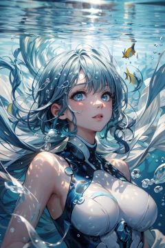 abstract background,(illustration:1),masterpiece,best quality,detailed face and eyes,1 girl,underwater hair physics,air bubbles,light coming through water,reflections,laying in water,split layers of water,school of fish,beauty,