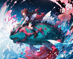 youweixuanyu,masterpiece,best quality,Highest picture quality,a girl riding on a fish,1girl,<lora:youweixuanyu_v4:0.7:OUTMIDD><lora:LAS:0.5> cloud,colorful, starry,