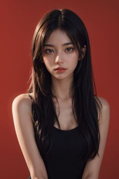 a 20 yo woman,long hair,dark theme, soothing tones, muted colors, high contrast, (natural skin texture, hyperrealism, soft light, sharp),red background,simple background, <lora:film:0.2>