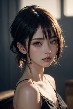 a 20 yo woman, black hair, (hi-top fade:1.3), dark theme, soothing tones, muted colors, high contrast, (natural skin texture, hyperrealism, soft light, sharp),golden holy aura glow, particles,exposure blend, medium shot, bokeh, (hdr:1.4), high contrast, (cinematic, teal and orange:0.85), (muted colors, dim colors, soothing tones:1.3), low saturation, (hyperdetailed:1.2), (noir:0.4)