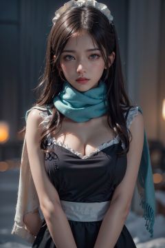 masterpiece,best quality,official art,extremely detailed CG unity 8k wallpaper,large breasts, 1girl, upper body, face close up,scarf, maid, snow shelter,exposure blend, medium shot, bokeh, (hdr:1.4), high contrast, (cinematic, teal and orange:0.85), (muted colors, dim colors, soothing tones:1.3),