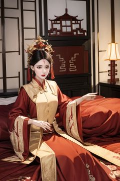 a woman in a red and gold dress, Phoenix crown,hair stick,(sitting on red bed), Cosmetic,shy,black_hair, looking down, (forehead dot),(2 red candles), chinese_clothes, curtains, earrings, hair_ornament, hanfu, indoors, jewelry, red nails, long_sleeves, red dress, red lips, tassel, (Red quilt),(red palace:1.2),(ancient Chinese architecture),(red:1.8),无