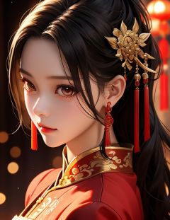 an asian girl in an old chinese dress, in the style of anime-inspired characters, romantic realism, firecore, light gold and light bronze, queencore, intense close-ups, lively illustrations<lora:belle_20230624072520:0.55555>