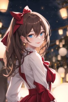 (extremely delicate and beautiful:1.2),1girl, bangs, blue eyes, blurry, blurry background, bow, brown hair, closed mouth, from side, hair between eyes, hair bow, lantern, light particles, long sleeves, looking at viewer, medium hair, night, red bow, solo, star \(symbol\), upper body,smile,red lips