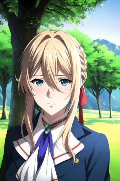 violet evergarden, masterpiece, best quality, 1girl, solo, blonde hair, blue eyes, hair between eyes, looking at viewer, ribbon, red ribbon, braid, hair ribbon, jacket, blue jacket, jewelry, bangs, outdoors, brooch, hair intakes, anime coloring, ascot, white ascot, tree, closed mouth, portrait, daygrass