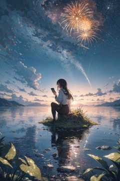 absurdres, highres, ultra detailed, (1girl:1.3),BREAK, Illustrate a vibrant night sky filled with colorful fireworks, celebrations, and a festive atmosphere.BREAK, Design a messenger from the spirit realm, with the ability to communicate with the dead, guide lost souls, and traverse the veil between worlds.BREAK, Create a panoramic image, capturing a wide field of view and showcasing expansive landscapes or cityscapes.BREAK, Capture a serene lakeside view, with calm waters, lush vegetation, and a sense of tranquility and reflection.BREAK, Illustrate a subject relaxing in a grassy meadow, capturing their sense of peace, contentment, and connection to nature.BREAK, Create a surreal dreamscape, with distorted perspectives, bizarre juxtapositions, and a sense of the fantastical that defies logic and reason.