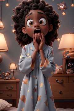 masterpiece, best quality,a surprised little black girl wearing pajamas on a bed wwith her hand on her chin,  stars on the wall background