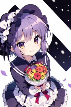 1girl, solo, eyes, smile, bangs, skirt, shirt, long_sleeves, dress, bow, holding, closed_mouth, flower, frills, petals, bouquet, holding_flower, center_frills, bonnet, holding_bouquet, colorful, blue sky, dutch angle, <lora:NagatoYuki_NAI_V1.0:0.8>,nagato yuki,nagato-chan,school uniform, white background, looking to the side,purple hair, snow, snowing,