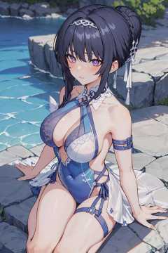 ultra high res,masterpiece,best quality,1girl,<lora:yae swimsuit_v2:0.6>,yae,side braid,updo hair,mature female,blue one-piece swimsuit,thigh strap,outdoors,wariza,cleavage,blush,from above,