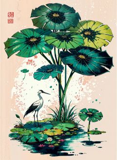 A ink painting of a lotus pond with Chinese writing on it and a crane standing nearby, with a lotus leaf in the foreground, An Zhengwen, organic painting, a minimalist painting, art & language, ink and wash,,