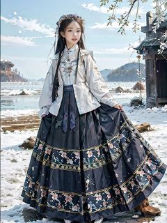a girl,solo,masterpiece, best quality,long hair,(full body:1.31) ultra high res, cowboy shot, (photorealistic:1.4), raw photo, snowing, Frozen lakes, (detailed face, detailed eyes), red eyeshadow, little smile, beautiful legs, 1girl, solo, ,(hanfu, tang style outfits, blue long upper shan, white chest pleated skirt, pibo) <lora:hanfuMing_v31:0.6> <lora:gufenggirl-08:0.5>