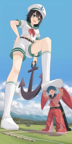 masterpiece,best quality,(giantess),cunsha,  (size_difference),(multiple girls),(1boy),1girl,(miniboy:1.2,man),standing,feet up,(tread),white legwear,white socks, anchor, giant, giantess,  <lora:cunsha_any3_BETA-000010:0.7>,short_hair, open_mouth,black_hair,green_eyes, shorts, socks, belt, minigirl, sailor_hat,