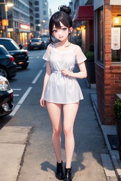 masterpiece, best quality,standing, black hair bun,cold face, full body,happy,light effect, soft, super clear, high-definition picture, (front),cityscape,