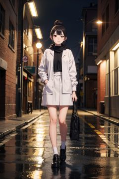 masterpiece, best quality,standing, black hair bun,cold face, full body,happy,light effect, soft, super clear, high-definition picture, (front),cityscape,