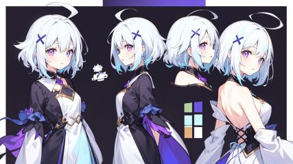 (((simple background))),(cowboy shot:0.8),1 girl, solo, (mature:1.2), (purple eyes), (x-shaped ornament:1.1), medium hair, messy hair, (white hair:1.28), (light blue hair:1.2), (++iridescent color hair:1.26), ahoge, swept bangs, hair intakes, medium breasts, drunk, (fang out:1.1), closed mouth, (light smile:0.8),(from side, multiple views, from behind), (expressions), ((databook)), (annotated), ((costume chart)), ((((how to)))),<lora:画风新海诚:0.4> <lora:画风焦茶v1.0:0.4> <lora:画风ohisashiburi V2.0:0.4>