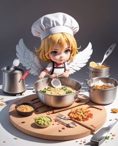 best quality,masterpiece,absurdres,white background,halo,candoluminescence,card games,full body,lens flare,sun,vivid colors,(((archangel Gabriel))), angel, girl, chef, chef's hat, apron, kitchen, work table, Knives, Cutting board, Pots and pans, Ingredients, Utensils, Oven, Stove, Blender, Mixer, Scales, Grater, Measuring cups, spoons, Whisk, Colander, Food processor, Thermometer, Tongs, Spatula, Cookware, Griddle, Rolling pin, Zester, Mortar and pestle,full body,chibi,,