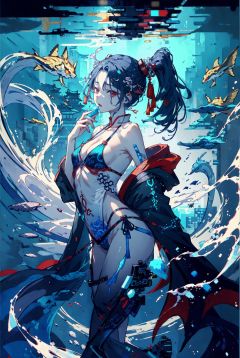 xhuoguo,<lyco:XhuoguoV2:1.0> cyberpunk,1girl ,split ponytail, highleg bikini,halftone, partially underwater shot,age progression,  beautiful detailed water,hand to own mouth,abstract,