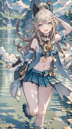 (masterpiece),(best quality),(ultra-detailed),(illustration), 1girl, detailed body, detailed face, detailed hair, detailed eyes,<lora:shenlilinghua-000009:1> smile, happy, open mouth, arms beside, detailed landscape, detailed background, summer, nostalgia, cumulonimbus, clouds, puddles, reflected on the water, railroad, <lora:Genshin_Kirara_AP_v1:1>,Cute cat movements