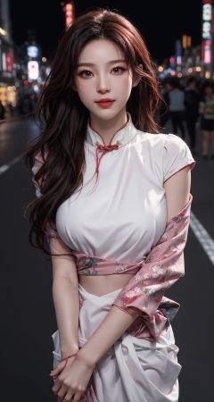 1girl,happy,tokyo street,city lights,flexing,close-up,8k,raw photo,best quality,masterpiece,realistic,photo-realistic,(large breasts:1.3),lips,solo,elegant,highly detailed,majestic,digital photography,detailed eyes,<lora:llfmafanshu:0.7>,(Upper body above waist:1.5),white cheongsam,Long pink hair,
