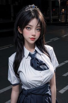 1girl,happy,tokyo street,city lights,flexing,close-up,8k,raw photo,best quality,masterpiece,realistic,photo-realistic,(large breasts:1.3),lips,solo,elegant,highly detailed,majestic,digital photography,detailed eyes,tiara,<lora:ayV3:0.5>,(Upper body above waist:1.5),(School uniform:1.5),