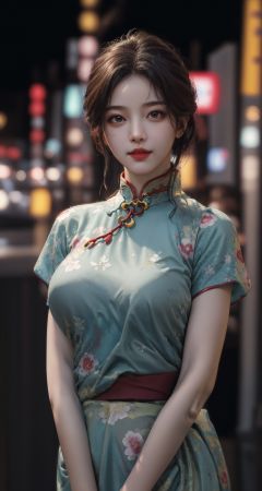 1girl,happy,tokyo street,city lights,flexing,close-up,8k,raw photo,best quality,masterpiece,realistic,photo-realistic,(large breasts:1.3),lips,solo,elegant,highly detailed,<lora:llfchenxiaoyun:0.5>,majestic,digital photography,detailed eyes,(Upper body above waist:1.5),(cheongsam:1.2),