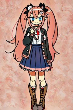 GOJIO,1girl, enoshima junko, long hair, skirt, boots, twintails, hair ornament, bear hair ornament, necktie, smile, blue eyes, pink background, black footwear, cleavage, bow, monokuma, breasts, red skirt, cross-laced footwear, simple background, bangs, choker, full body, plaid skirt, miniskirt, pleated skirt, lace-up boots, white necktie, solo, plaid, stuffed toy, shirt, looking at viewer, nail polish, pink hair, grin, black choker, black necktie, stuffed animal, hand on own face, red bow, knee boots, black shirt, holding