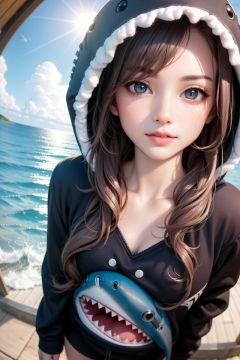 (masterpiece), best quality, ultra-detailed,illustration,8K,beautiful detailed eyes, (beautiful detailed face), ((realistic face)), cute face,small breasts,blue gray hair, white eye, glowing eye,1girl,((solo)),(shark girl),(Shark plush hood),((Fluffy clothes)),((cowboy shot)), standing posture, from below,perspective,((fisheye lens)), outdoors,sky,sunlight, seaside,