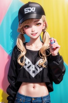 best quality, high resolution, distinct image, best quality, high resolution, distinct image, Original Characters, Natural Volumetric Lighting And Best Shadows, Deep Depth Of Field, Sharp Focus, Portrait Of Stunningly Beautiful Petite Girl, Soft Delicate Beautiful Attractive Face With Alluring Yellow Eyes, Lovely Small Breasts, Sharp Eyeliner, Seductive Smiling, Open Mouth With Cute Fangs Out, Windswept Disheveled Brown Hair, Thick Layered Medium Twintail Hairstyles, Blush Eyeshadow With Thick Eyelashes, Parted Lips, Applejack Hat, Oversized Pop-Art Jacket, Slim Waist With Open Cute Navel, Denim Jeans Pants With Buckle Belt, (Messy Painted Body:1.05), (Holding Spray Paint Can:1.1), (Graffiti Murals Wall Background:1.15), (Standing On Narrow City Streets Crossword:1.2), (Highest Quality, Amazing Details:1.4), Masterpiece, Bloom, Picturesque, Brilliant Colorful Paintings