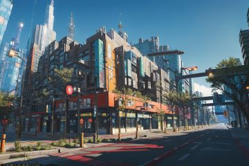 commercial street,front view,building,motor vehicle,car,ground vehicle,outdoors,tree,lighting,scenery,real world location,sky,blue sky,road,day,city,cityscape,street,tower.,32,高清