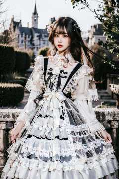 realistic, photorealistic, masterpiece, best quality, top quality, ultra high res, lolita_dress, 1girl, solo, slim, looking at viewer, cowboy shot, long hair, standing, dynamic pose, detailed background, in garden, castle, netural lighting, (pureerosface_v1:0.5), <lora:Cute Asian Face:0.2>, <lora:chinaDollLikeness_v10:0.7>, <lora:lolita_fasion_dress_classic_style2:0.7>