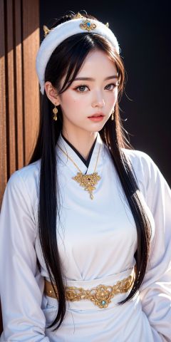Black hair, long hair, straight hair, high ponytail, gorgeous headwear, black eyes, upper body vertical painting, illustrations, immortal white black Hanfu, flowing thin gauze, ancient Chinese style, fairyland moonlit night, precious jewelry, long sword, (huge white tiger), white tiger, the best quality, original, very detailed, masterpiece, very detailed, CG, 8k, exquisite face, fine hair, beautiful, gorgeous, noble, Mu Xia, Wide robe with large sleeves, divinity, masterpiece, classical temperament, Chinoiserie style