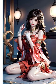Girl, young and beautiful, tall and beautiful,daqiao, <lora:chilloutmixss_xss10:0.2>,red clothes, red_dress,high heels,thighhighs,upper body,  <lora:taiwanDollLikeness_v10:0.2>,anklet, barefoot, jewelry, solo, braid, sitting, black hair, bracelet,proportionate,ultra realistic,((white gloves)), light smile,